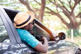 African man driver Wearing sunglasses and smiling while sitting in a car with open front window.