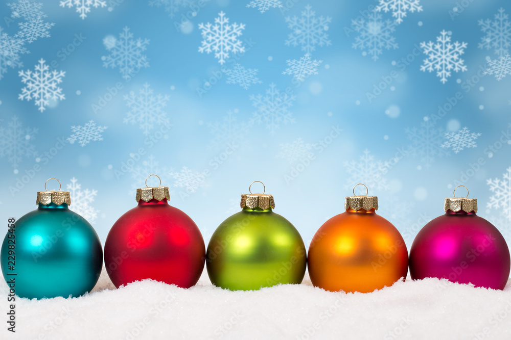 Weihnachten viele bunte Weihnachtskugeln Dekoration Schneeflocken Schnee Winter