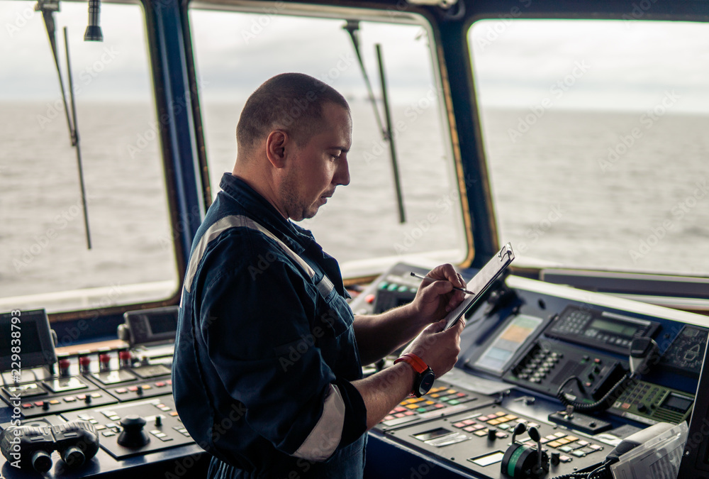 Marine navigational officer or chief mate on navigation watch on ship or vessel. He fills up checklist. Ship routine paperwork
