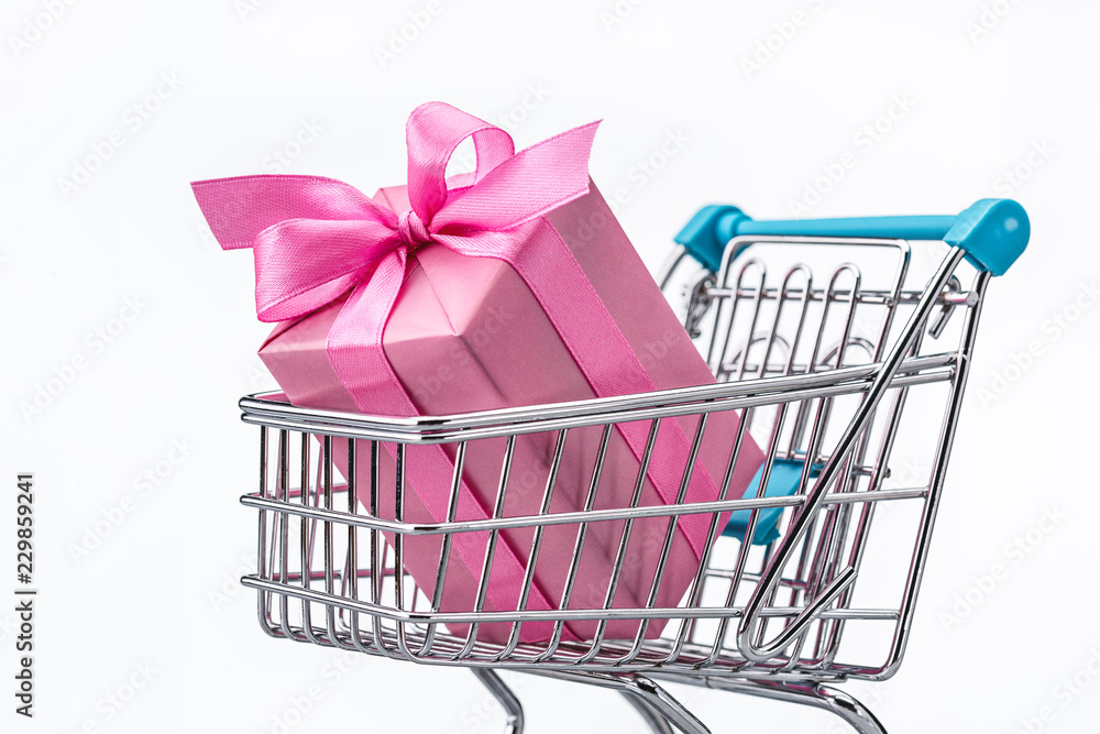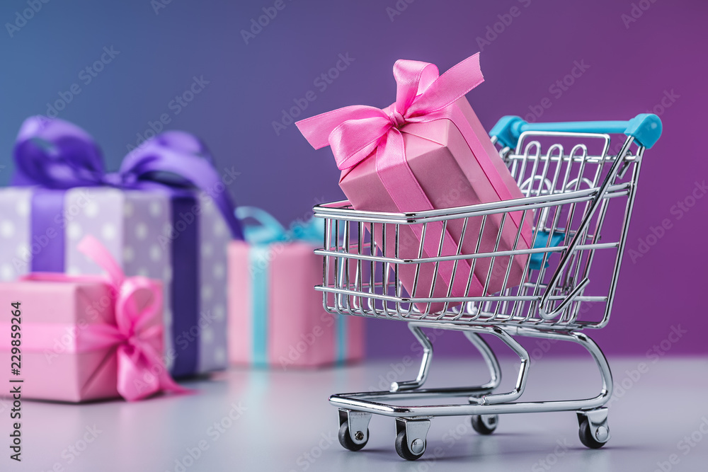 Festive background, gifts in boxes, packed in pink and blue in polka dot, decorated with ribbons and bows. Shopping cart
