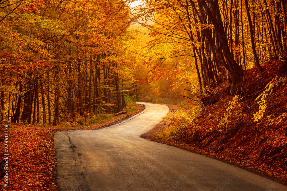Beautiful autumn landscape with fallen dry red leaves, road through the forest and yellow trees