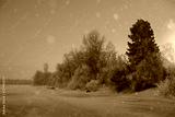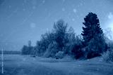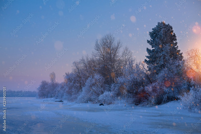 beautiful Christmas Landscape; winter Landscape with Frozen lake and snowy trees