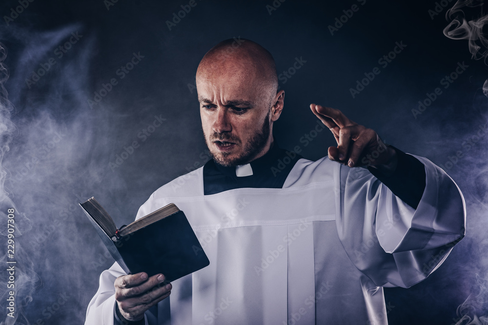 Catholic priest in white surplice and black shirt with cleric collar reading bible