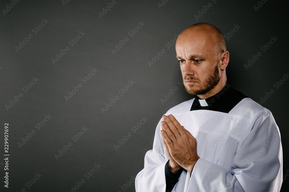 Catholic priest in white surplice prays