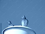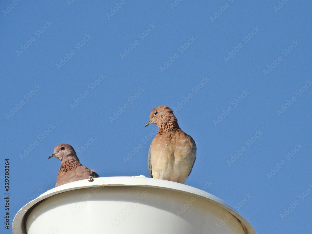A pair of turtle doves sits on a lantern against a cloudless blue sky - tender and loyal birds.