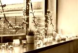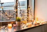 hygge, decoration and christmas concept - candles burning in lanterns and festive garland on window sill at home