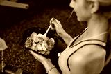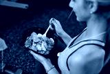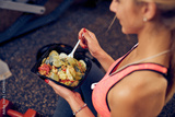 Top view of woman eating healthy food while sitting in a gym. Heatlhy lifestyle concept.