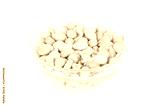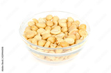 Roasted and salted peanuts in glass bowl. Shelled Arachis hypogaea, also called groundnut or goober, used as a snack. Isolated macro food photo, close up, from above, on white background.