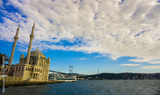 Beautiful view of famous Ortakoy Mosque (Ortakoy Camii) and Bosphorus Bridge (Bogaz Koprusu), Istanbul. Landscape of old Buyuk Mecidiye Mosque under cloudy sky. Islamic house of worship for Muslims.