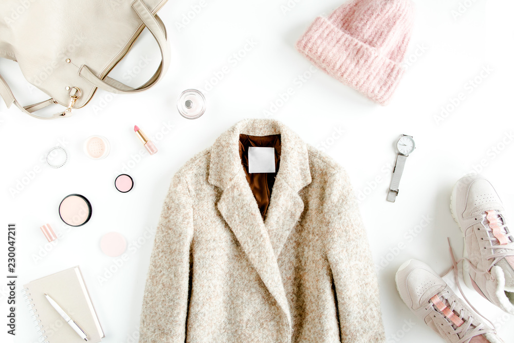 Women fashion clothes and accessories. Flat lay female autumn style look with warm coat, cap, sneakers, on white background. Top view.