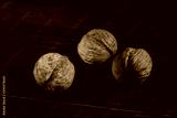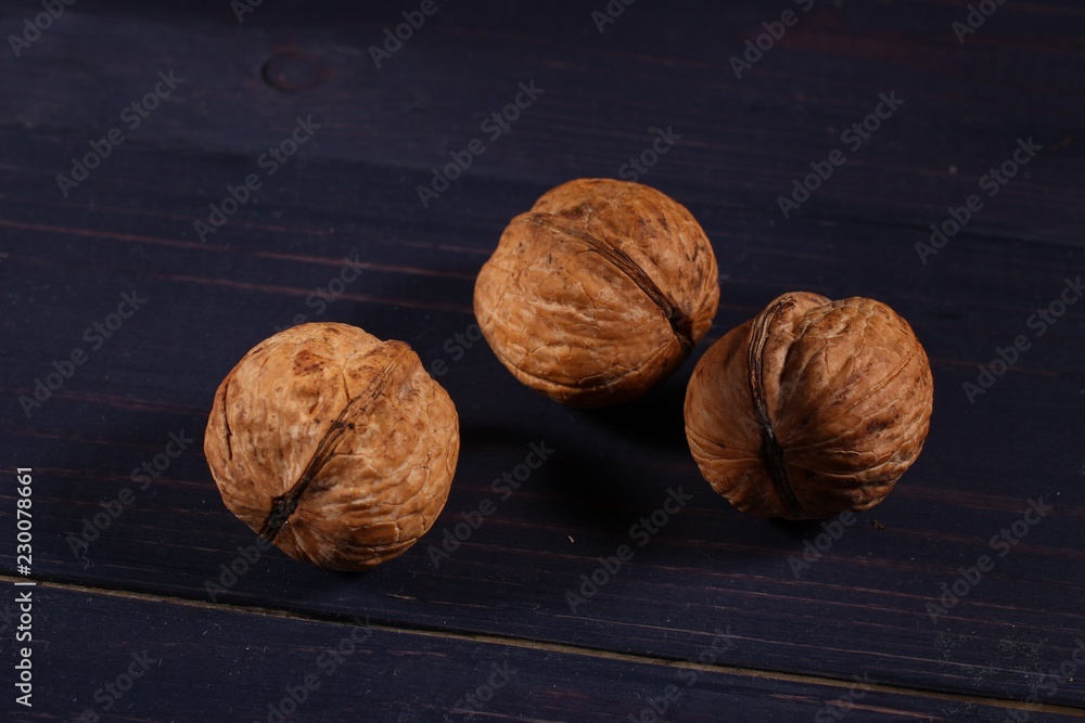 Three walnuts on a dark board close up