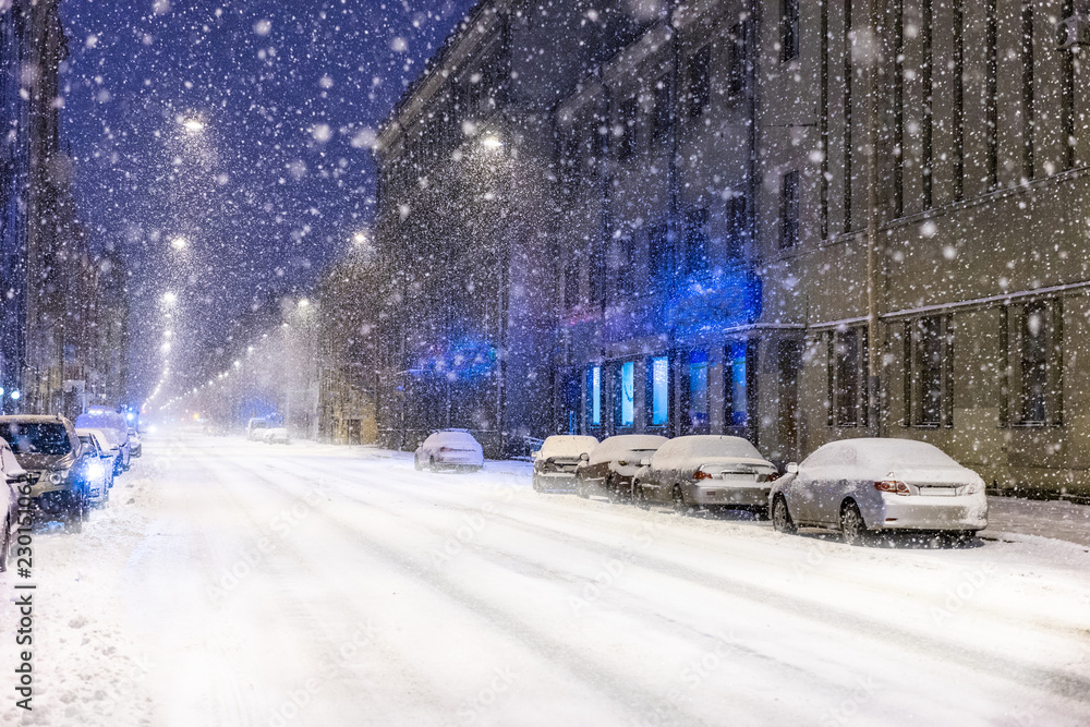Large snow. The snow has powdered the street. Snowfall. Winter. Winter street.