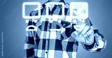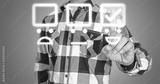 Businessman touch smiley face emoticon on virtual touch screen. Customer service evaluation concept.