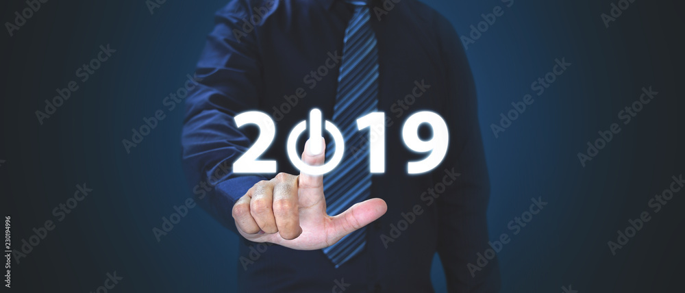 Businessman pressing 2019 start up business icon over blue background, Happy new year 2019 concept