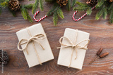 Christmas composition background on wood table with gift boxes and pine branches with cones. Top view with copy space, flat lay.