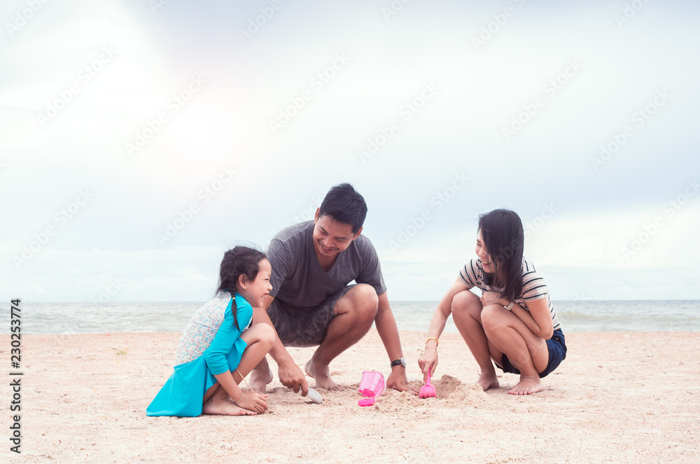 Father, mother and daughter are making sand piles on the beach.Happy family concept