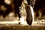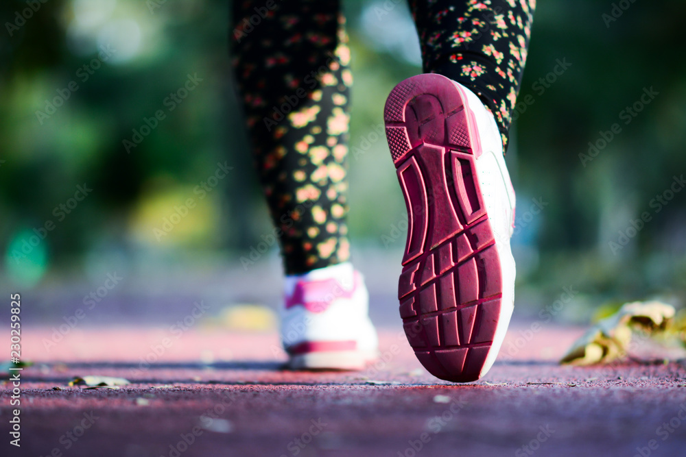 Fitness woman training and jogging in Autumn park, close up on running shoes in sunlight sideways. Healthy lifestyle and sport concept.