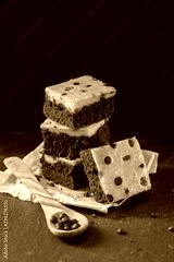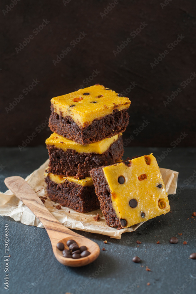 Brownies with cheese cake made from pumpkin, decorated with pease of chocolate and lingonberry