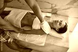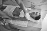 Careful experienced hammam worker wearing kese and doing necessary pilling for a young lady