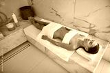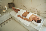 Slim young woman closing her eyes and looking peaceful while lying in hammam with towels on her body