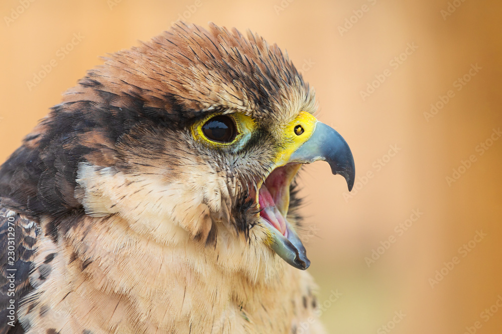 Lanner falcon - Falco biarmicus. Closeup portrait of Lanner falcon looking at camera. Bird of prey portrait