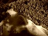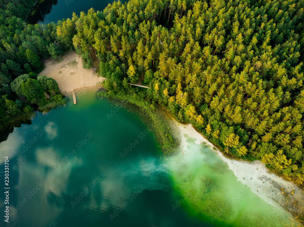 Aerial top down view of beautiful green waters of lake Gela. Birds eye view of scenic emerald lake surrounded by pine forests.