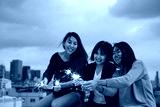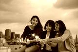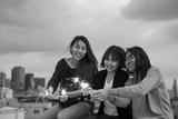 Happy group of asian girl friends enjoy and play sparkler at roof top party at evening sunset,Holiday celebration festive,teenage lifestyle,freedom and fun.