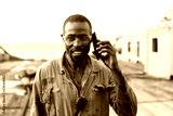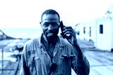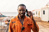 Marine Deck Officer or seaman on deck of vessel or ship . He is speaking on the mobile cell phone