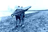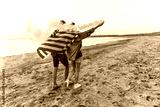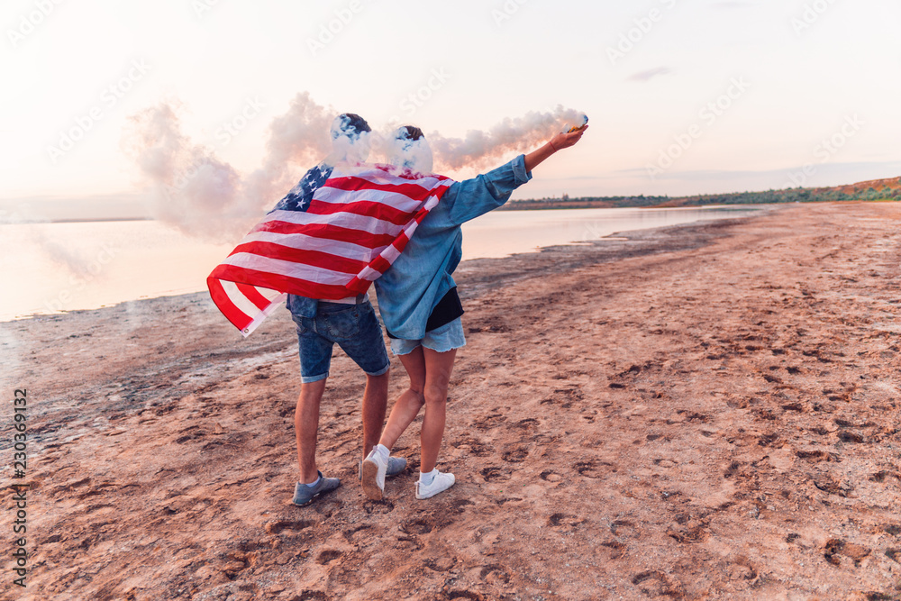american couple walking along the beach and holding hand flare or fusee covered in american flag. Freedom and independence concept
