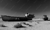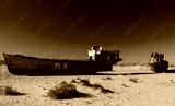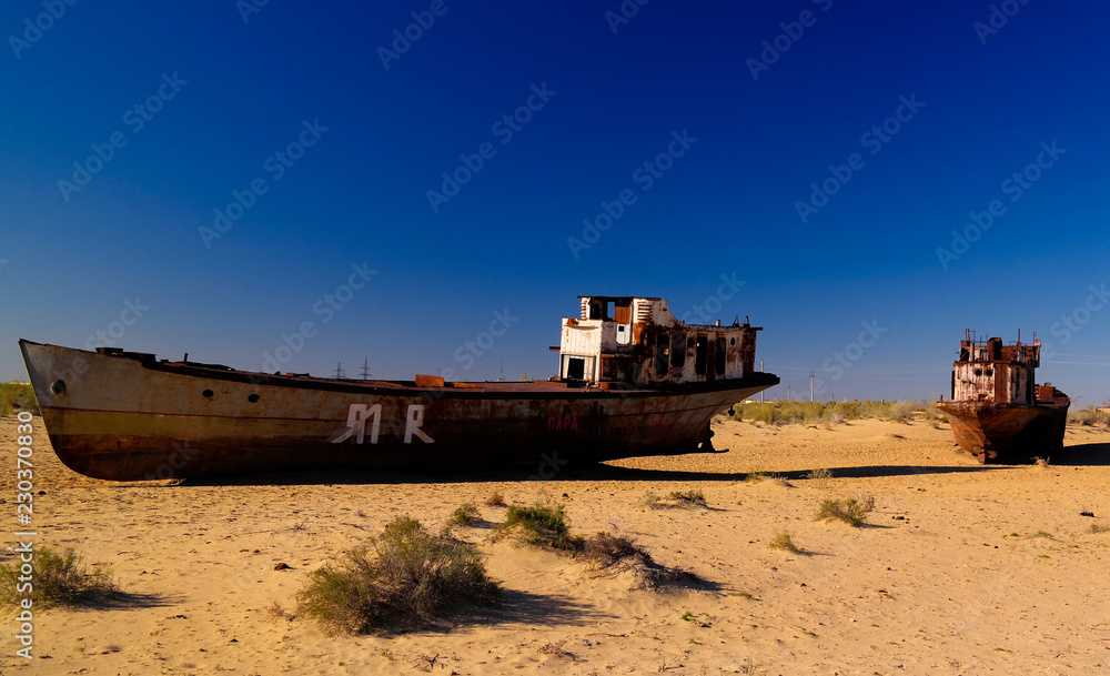 Panorama of ship cemetery near Moynaq at sunrise, Karakalpakstan, Uzbekistan