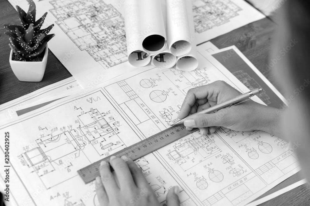 A girl (architect, student, businesswoman) works (draws, counts) at a table with business accessories (laptop, smartphone, pens, magnifier), accessories for drawing (plans, rulers) and training
