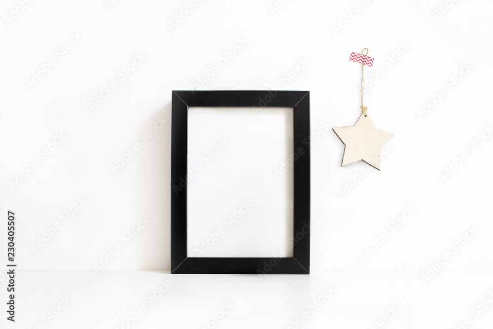 Vertical black blank wooden frame mockup on white table. Wooden star decoration hanging on the wall. Styled stock feminine photography. Home decor. Christmas winter concept.
