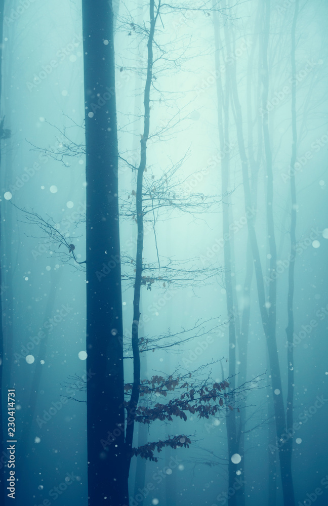 snow flakes falling in magical forest