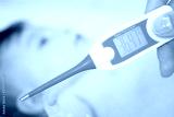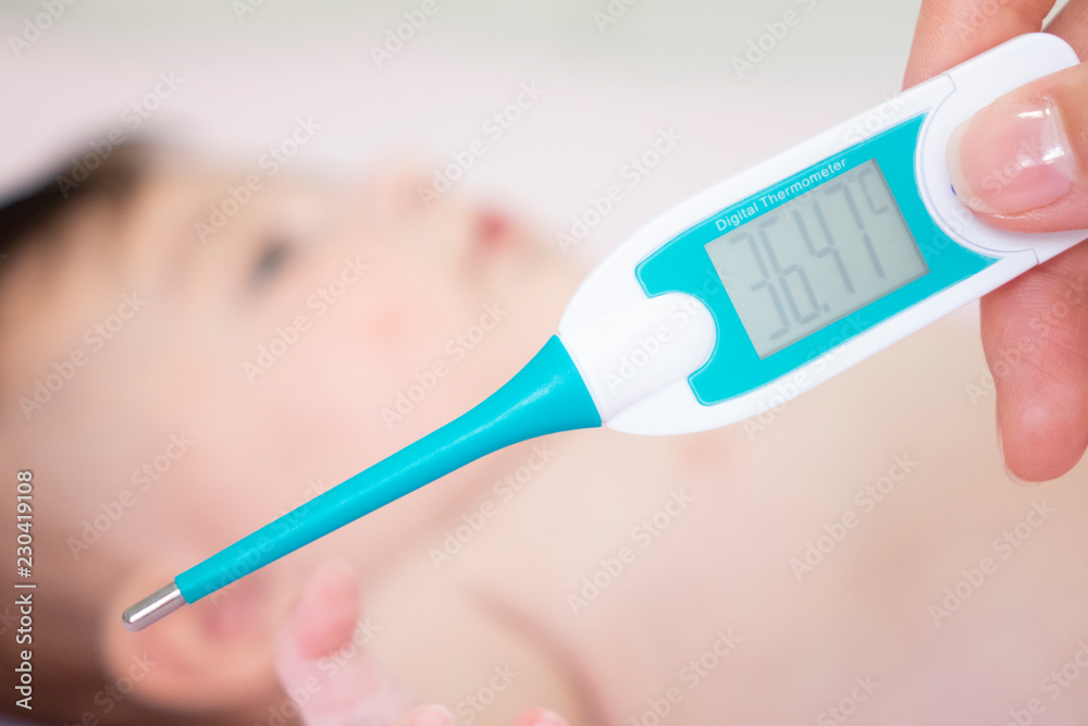 Baby sick with measuring electric thermometer. Child fever ill. Kid catch cold with temperature. Sick child in bed with fever measuring temperature with medical thermometer.