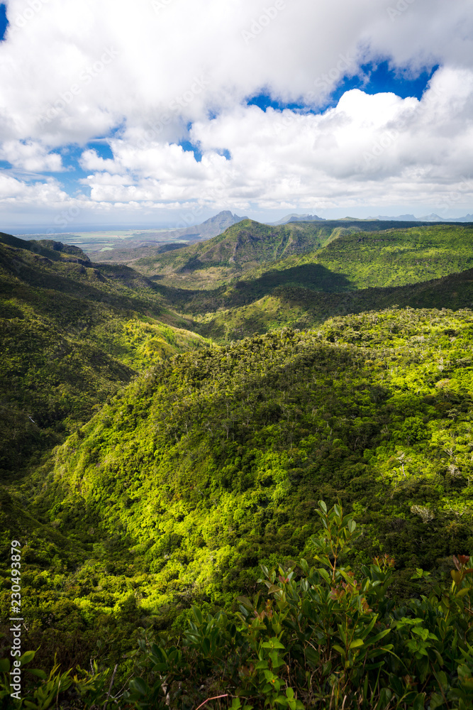 Panoramic view of Black River Gorges National Park, Gorges Viewpoint in Mauritius. It covers an area of 67.54 km including humid upland forest, drier lowland forest and marshy heathland.