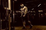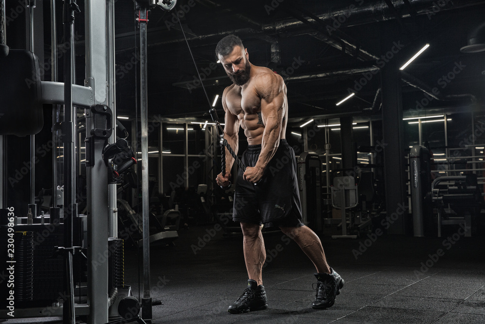 Young handsome male athlete bodybuilder weightlifter with idial abdominals, doing exercises in modern gym on a dark background. Exercises for the development of the triceps muscles.