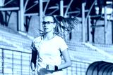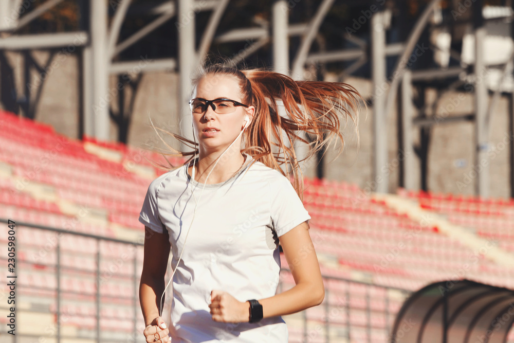Fitness blonde pretty woman wearing sport glasses listening music and jogging on the stadium, healthy lifestyle and people concept