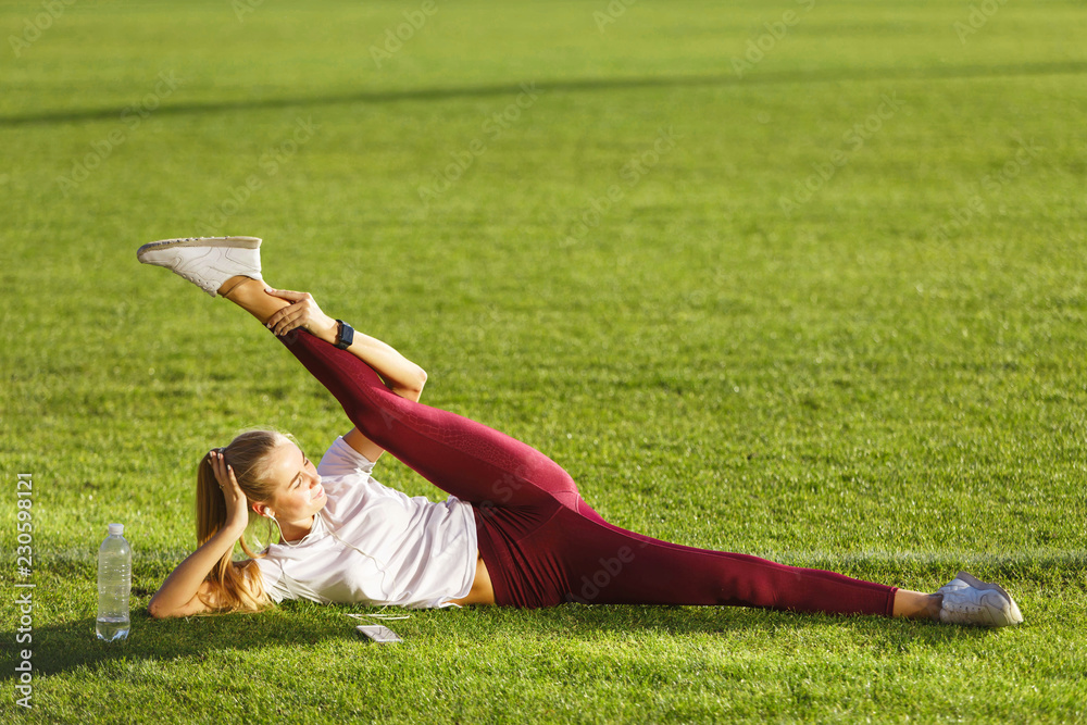 Fitness blonde long haired woman in sportswear laying on the grass, listening music and stretching at the football stadium outdoor, healthy lifestyle and people concept