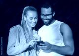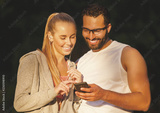 Multicultural handsome bearded man in white shirt wearing sport glasses and sportish pretty blonde long haired woman looking new sport application in the smartphone, healthy lifestyle and people