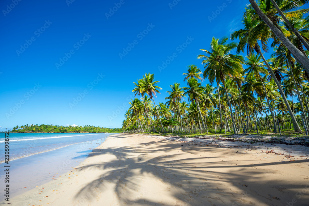 Bright scenic view of empty tropical beach with shadows of palm trees on wide shore in Bahia, Brazil