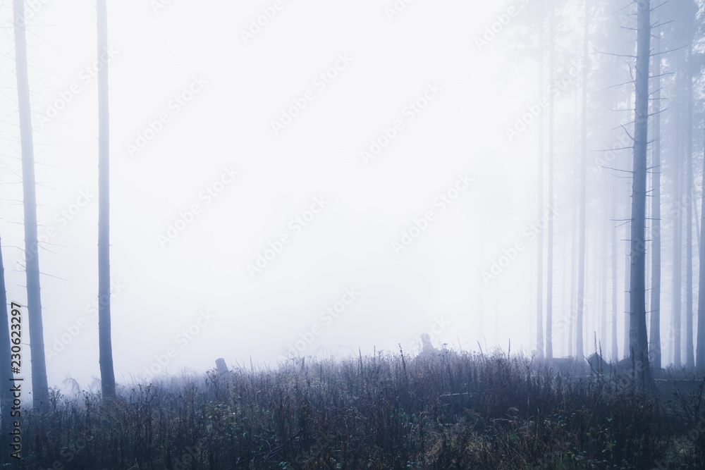 Große freie Lichtung im Wald. Viel Nebel und Licht