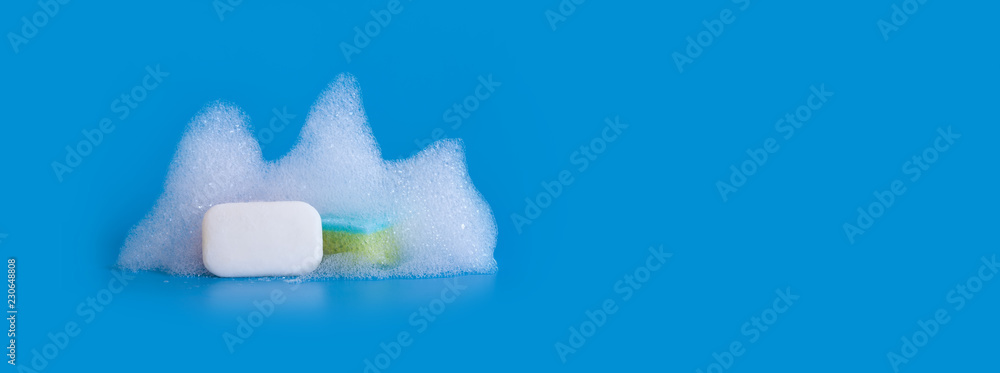 Soapy bubbles foam white soap and sponge on blue background. shallow depth of field. Copy space.