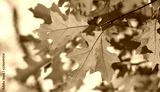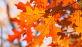 Beautiful Red oak tree branch autumn foliage macro view. Colorful orange brown leaves, sunny day forest scene. Selective focus