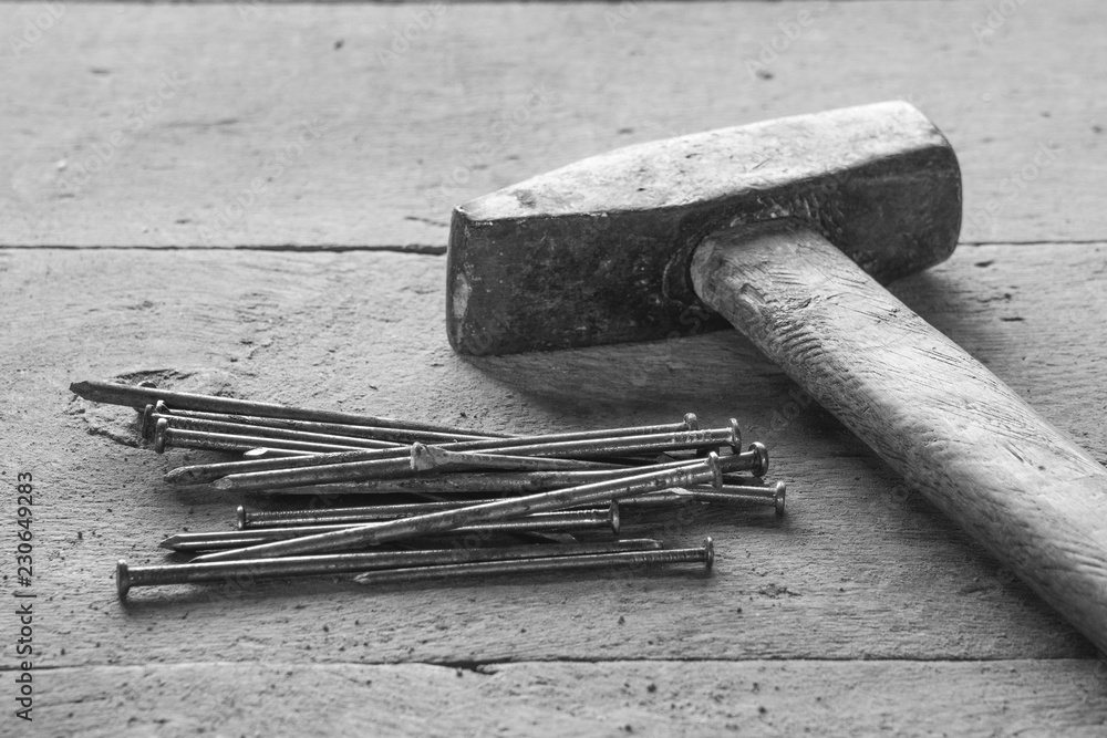 old hammer with rusty nails on a wooden table background, build materials,