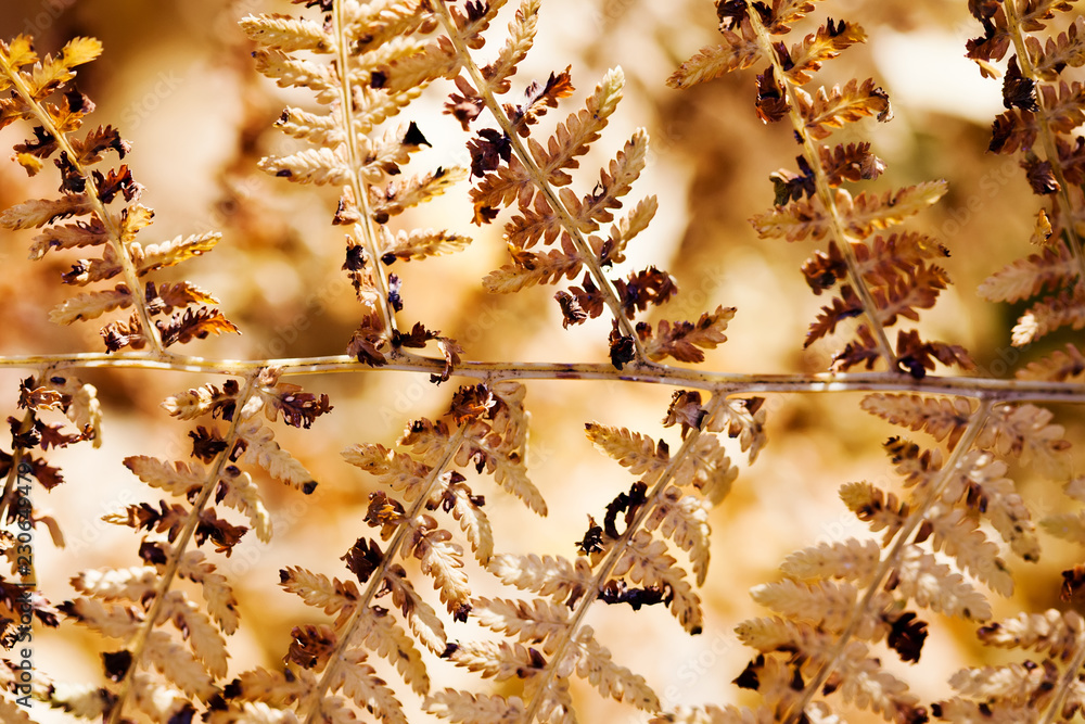 Autumnal fern leaf macro view. Aged brown yellow forest plant Dryopteris filix-mas pattern. Selective focus