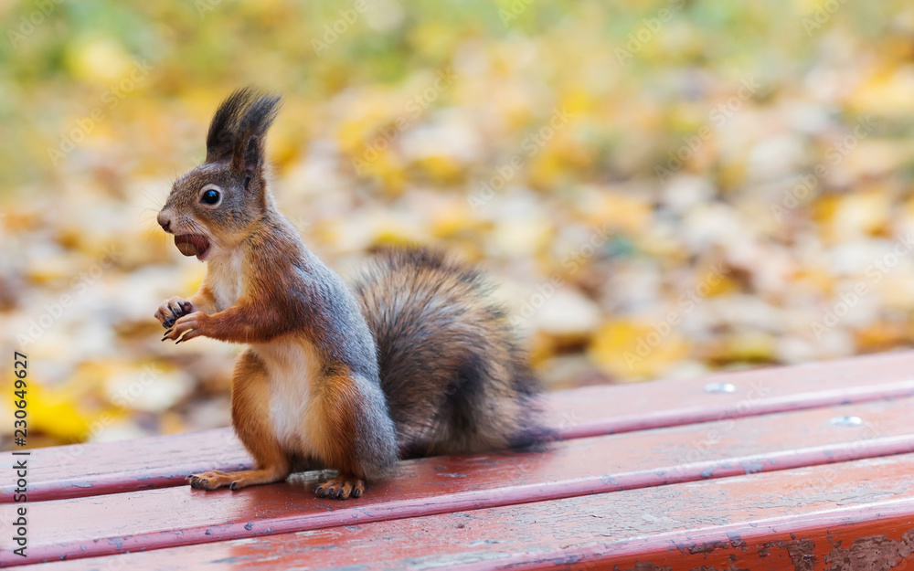 Red squirrel with a hazelnut in its mouth is standing on an old wooden bench. Copy space, autumn leaves background