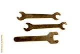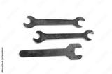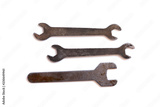 Rusty iron hand wrench close-up photo, copy space. Vintage hardware equipment tools collection on white background.