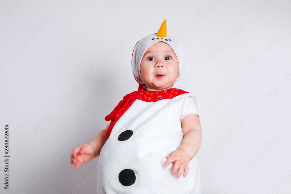 Merry Christmas and Happy New Year. Happy baby girl in snowman costume on white background