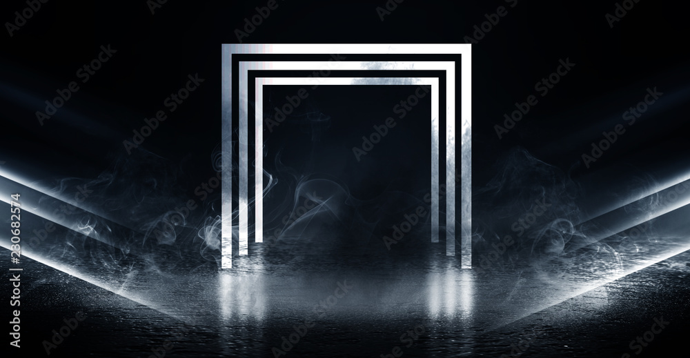Background of empty street at night, neon light, asphalt, concrete, smoke, smog