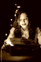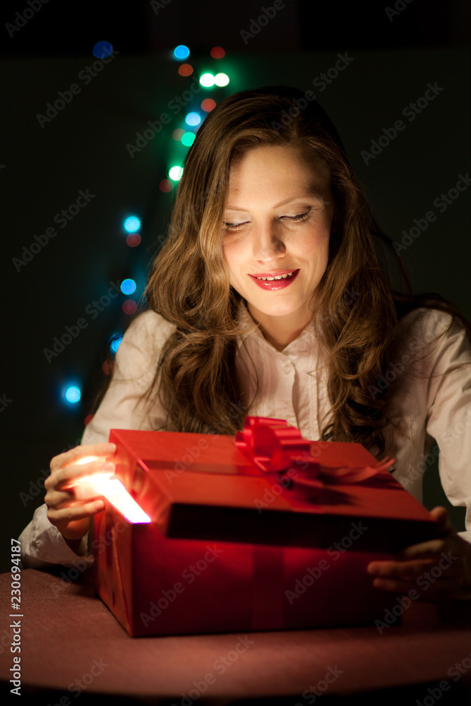 Beautiful girl opens a box with a gift